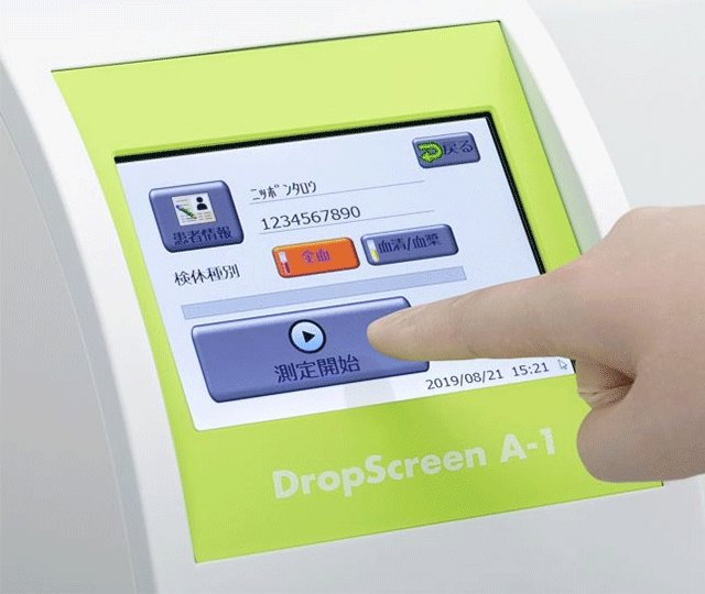 アレルギー原因迅速同定機器「ドロップスクリーン」を導入していますこの検査は、従来の注射針を使った採血をせず、指先から1滴(20μL)の血液を採取するだけで花粉症や食物アレルギーなどの原因である41項目のアレルゲンを調べることができるものです。